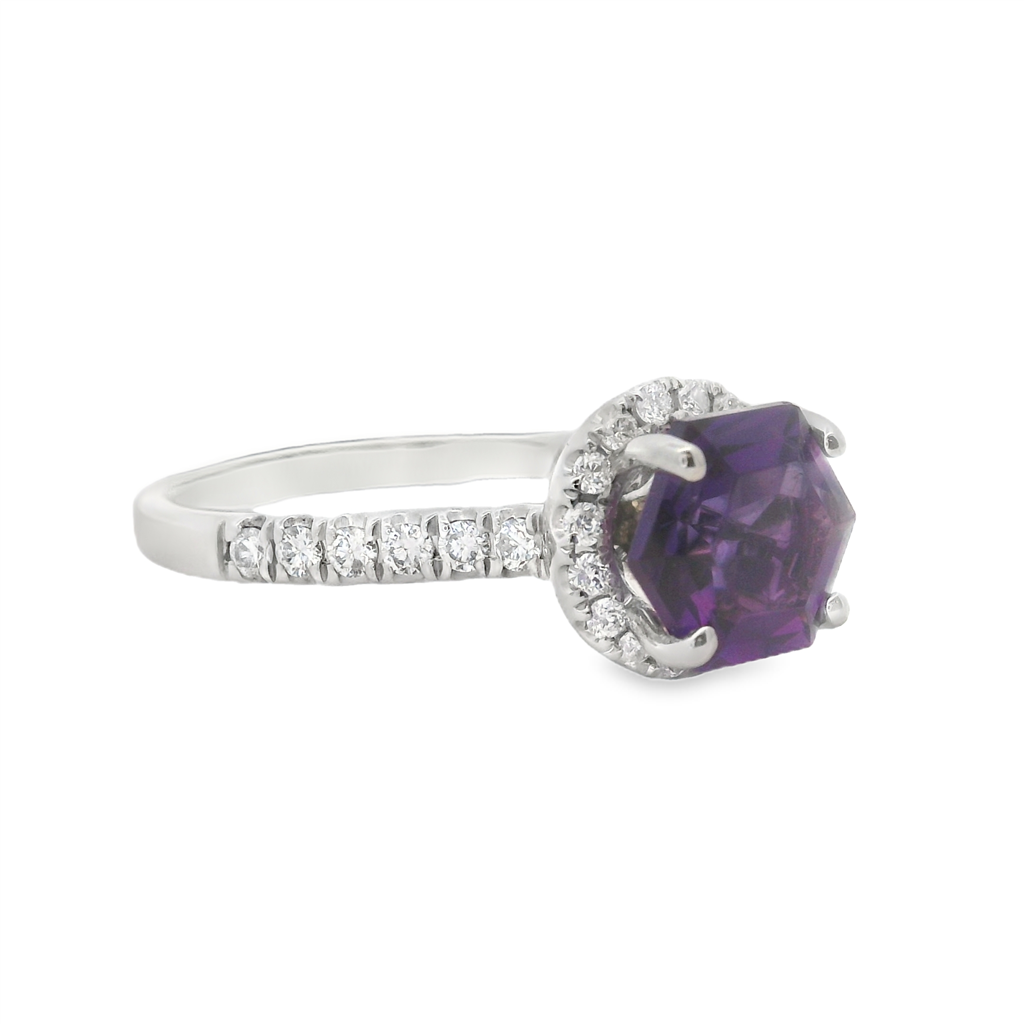 14K White Gold Amethyst Hexagon Diamond Halo Ring W/28D=0.32Cttw - Closeout Size 7