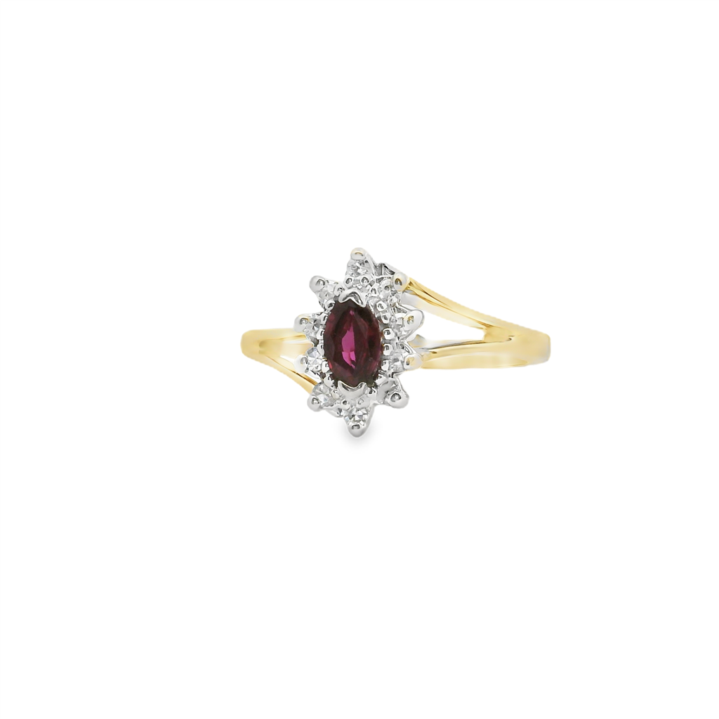 14K Y/G Halo Ring Marquise Lab Grown Ruby 10RDDia=.10APTW -Estate size 5.25