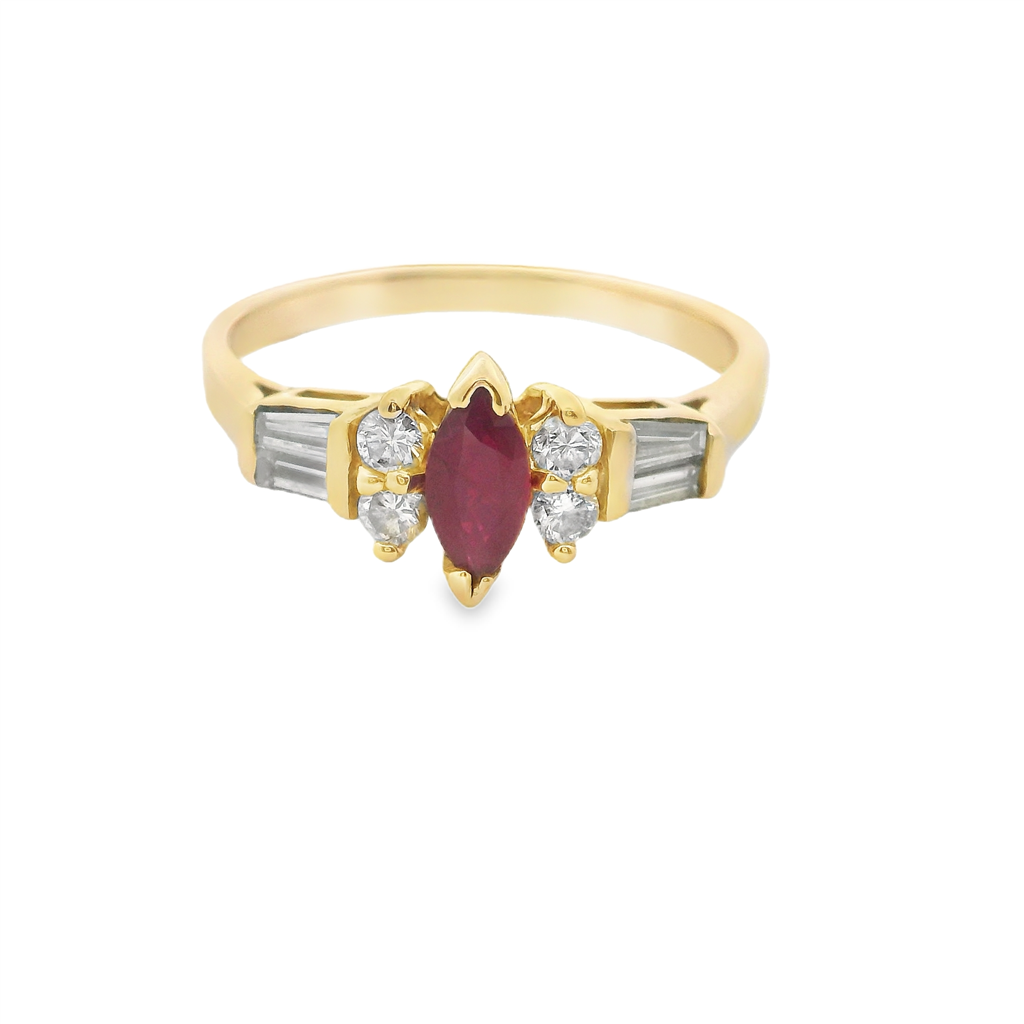 14K Y/G Ring 7X3.5 Mq Lab Ruby Rd+Bagdia=.35Aptw -Estate Size 9.5