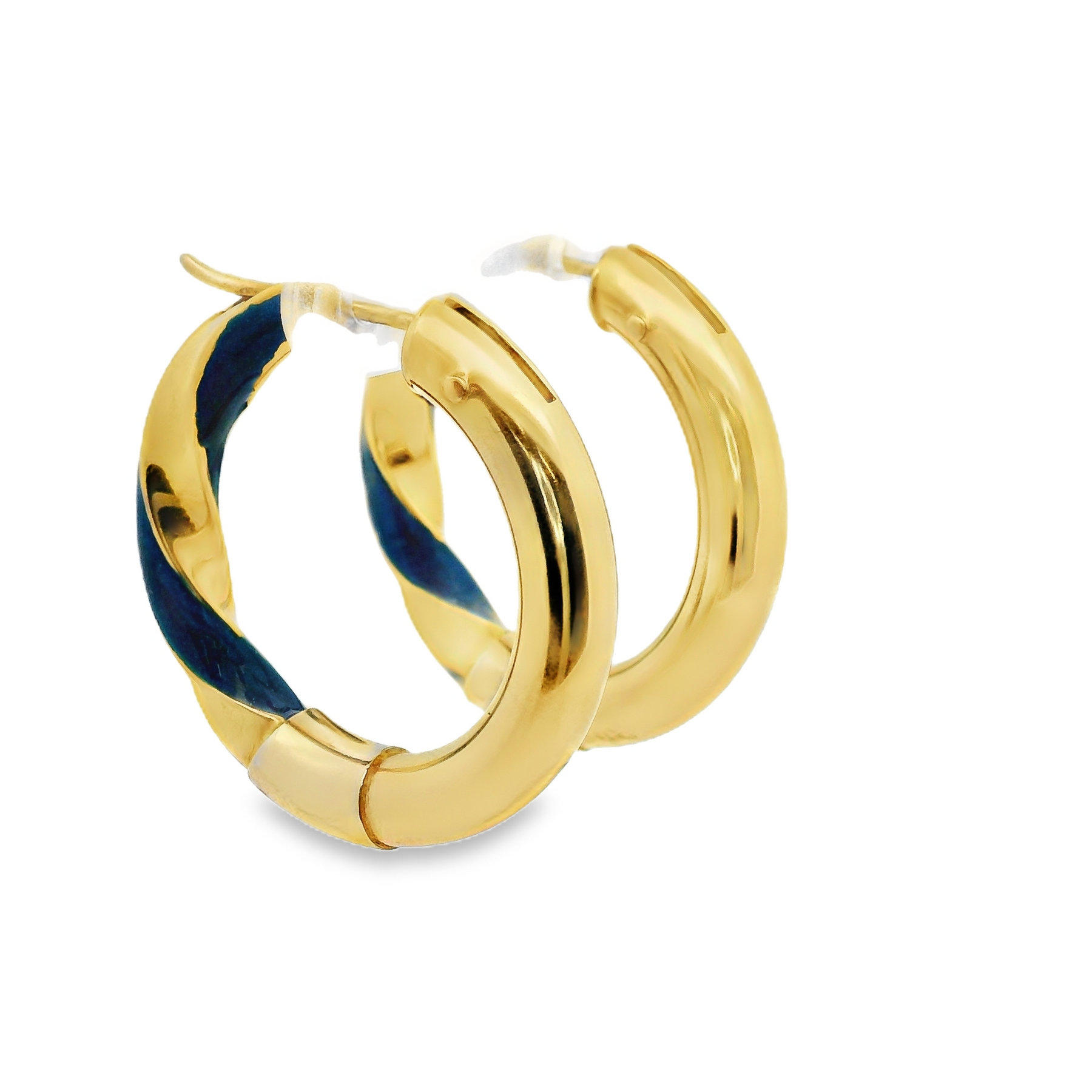 18K Yellow Gold Hoop Earrings With Blue Blue Enamel Twist - Estate